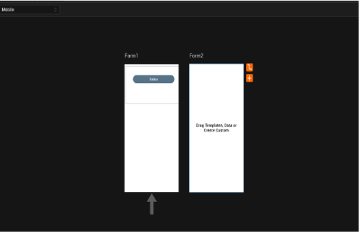 If you choose Root and then click Create Form, a new form named Form2 appears with a navigation link connecting to Form1. In the Project Explorer, Form2 is displayed under Mobile > Forms.