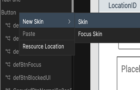 From the menu, click New Skin, and then click the type of new skin you want to create. Many widget types offer just the standard Skin, while others also offer a Focus Skin, or some variation.