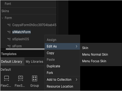 Note: You can also go to the Skins tab in Project Explorer, and right-click a skin to fork the skin.