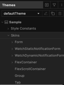 Volt MX Iris also provides a default theme that has a set of skins defined for all the widgets within an application. The skins in this theme can be applied to widgets to get a different look and feel for the widgets. Themes are accessed from the Skins tab of the Project Explorer.