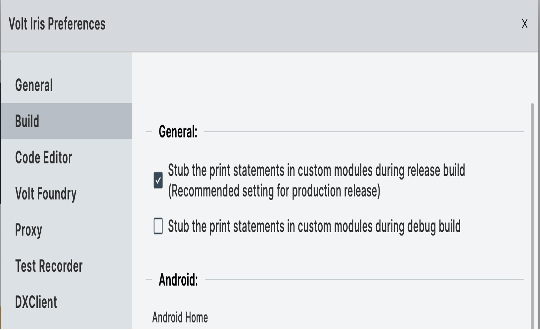 - Debug Mode builds. To disable the generation of print statements during Debug Mode builds, select the check box of the option titled Stub the print statements in custom modules during debug build.
