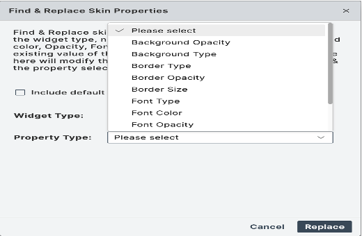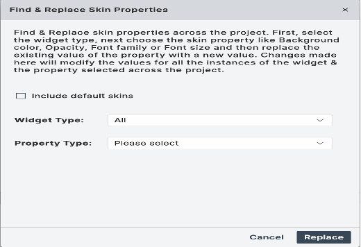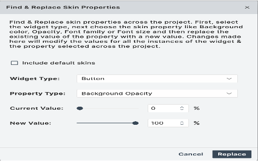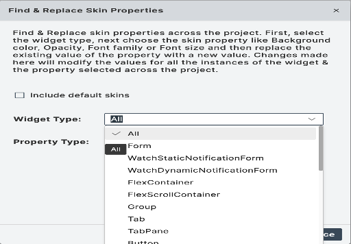 - Dependent or Platform-specific Skin properties cannot be changed using the Find and Replace option.