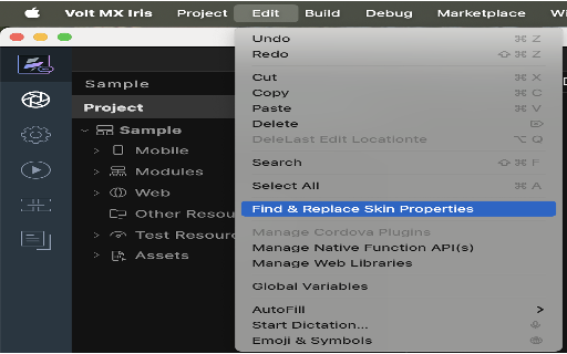 - From the Edit menu of Volt MX Iris, select Find and Replace Skin Properties.