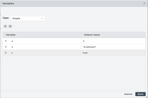 - To add a new row for another variable, click the + icon. To delete an added variable, select the row and click the red X icon. If you want to modify the order of the variables, click the upper and lower arrow icons as required.