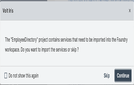If the project contains Volt MX Foundry Services associated with the app, Volt MX Iris displays a dialog box, prompting if you want to import the Services as part of the project import. Click Continue to import the Volt MX Foundry Services associated with the app. Click Skip to import the project without importing the Volt MX Foundry Services associated with the app.