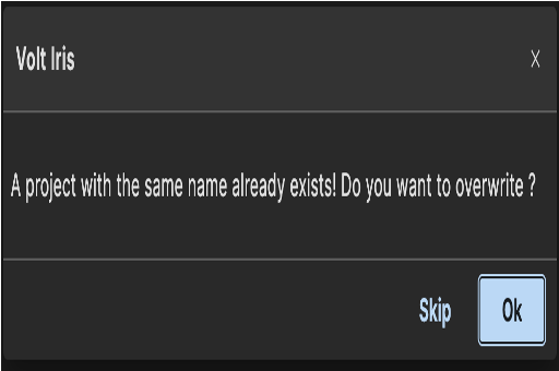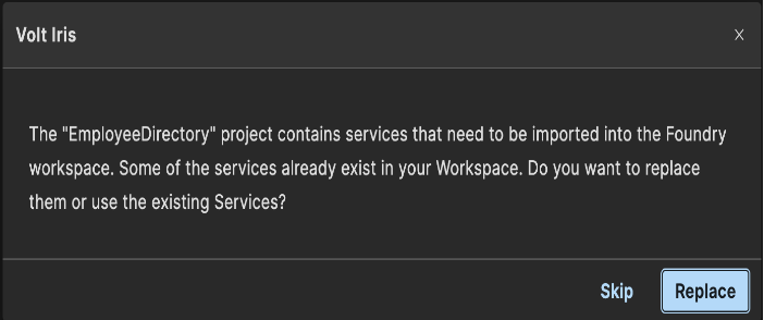 If your Volt MX Foundry account contains Services with the same name as the Services present in the imported project, Volt MX Iris displays a dialog box, prompting if you want to import the Services as part of the project import. Click Replace to import and associate the Volt MX Foundry Services associated with the app. Click Skip to use the Services present in your Volt MX Foundry account.