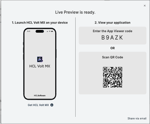 In Iris, you can see a Live Preview is ready window. The window contains App Details and QR code for the web app. Using the details, you can preview the web app on your device. For more details on how to view the app on your device, go to Preview an App on a Device.