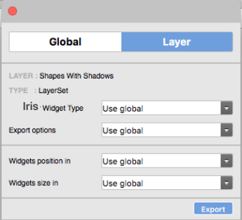 Select the global export option for Group and Shape layers. Depending on the VoltMX Iris widget type that you selected for Shape layers, you can have such elements converted in either of the following two ways: