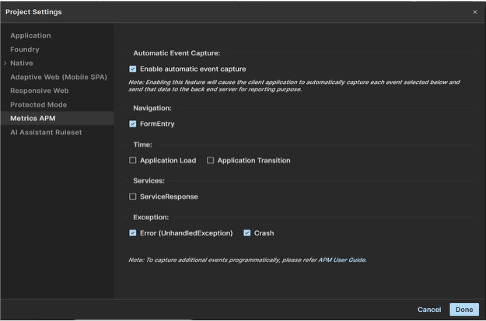 Exceptions: To capture when an unhandled error exception takes place, check Error. To capture when the app crashes, check Crash.