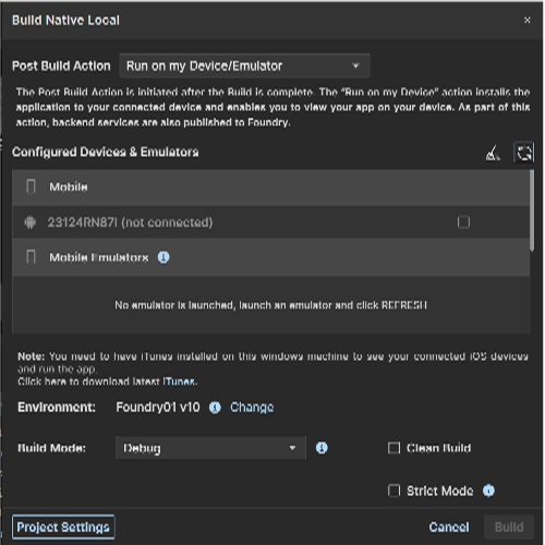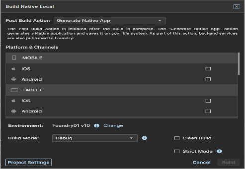 - Generate Native App – This action generates the binaries and build logs for your Native application and saves it on your file system