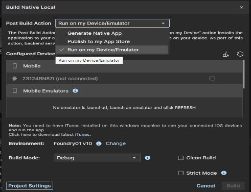Volt MX Iris supports cloud builds of the application for the selected platforms and performs the selected Post Build Action. There are two types of Post Build Actions: