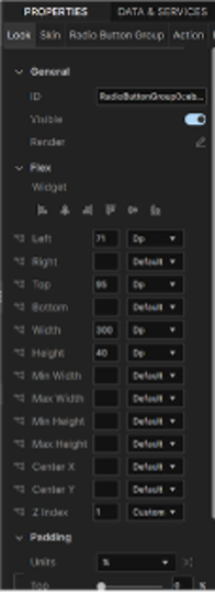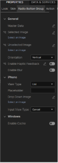 RadioButtonGroup properties specify properties that are available on any platform supported by Volt MX Iris, and assign platform-specific properties.
