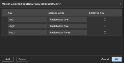 To add more radio buttons to the widget, click Add. To delete a radio button, click inside a cell, and then click Delete.