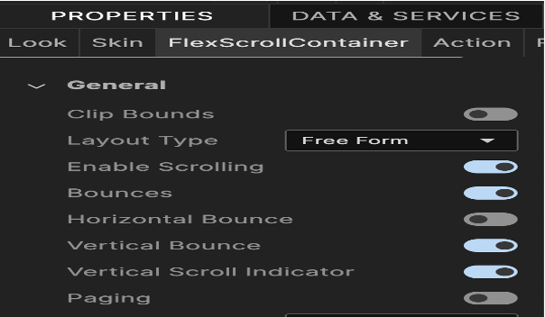 - From the Properties panel, navigate to the FlexScrollContainer tab.
