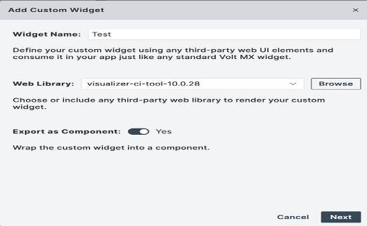 The custom widget is added as a new widget to the Default Library of Volt MX Iris. - Click Next.