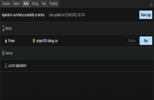 Once the build is complete, details of the generated binaries appear in the Build.If you select Run on my Device/Emulator under the Post Build Action tab, the application installs and runs on the selected emulator.