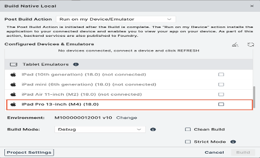 The Build Native Local/Build and Publish Native window appears.Note: For iOS, Launching an Emulator is not supported through the Build and Publish Native option.