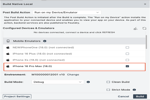 The Build Native Local window appears. - From the Post Build Action drop-down list, select Generate Native App or Run on my Device/Emulator.