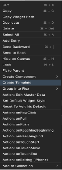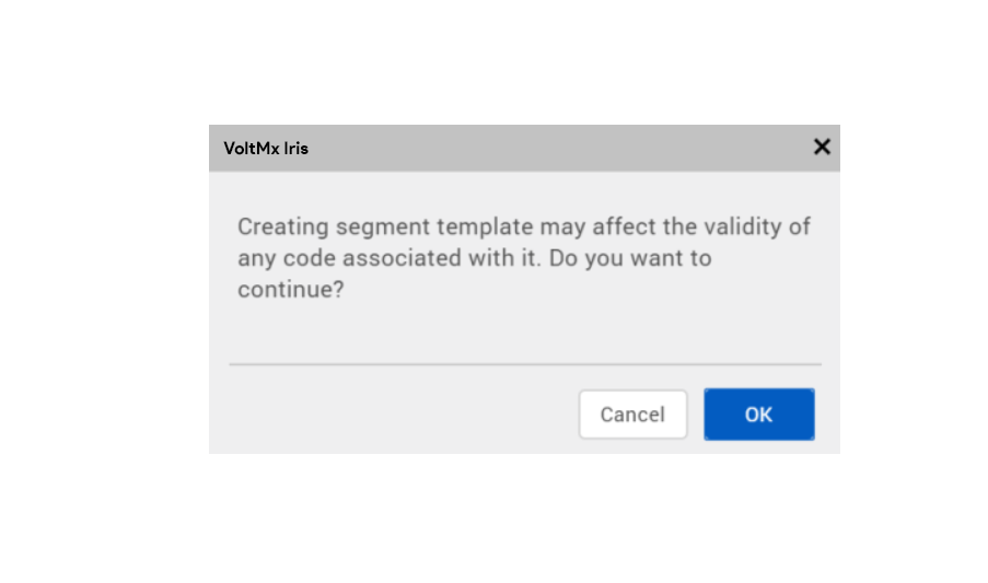 Click Create Template. Volt MX Iris displays a dialog box stating that if you have added a code snippet for the widgets inside the Segment Template, the associated code will be cloned in the Segment Template; but, the references in the custom code will not be modified appropriately. You must manually make the changes to the references in the custom code.