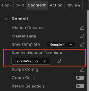 Specifies the common template to be used for each section while creating the section header and filling the data. This is optional parameter and if not provided the default template provided by each platform will be used. It can also be provided at each section level when setting the data. You can create a new template without going to the Templates section using the Create New option from the drop-down list. You can also edit a template inline in the segment.