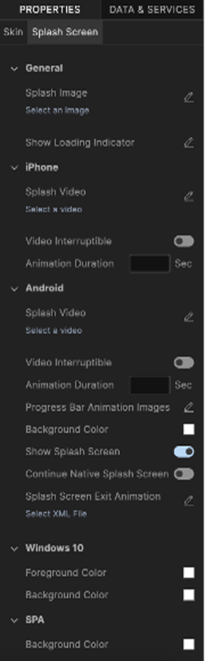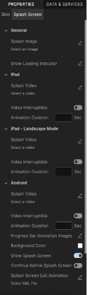 Volt MX Iris has deprecated support for the iOS Splash screens. You must use the Launch Storyboard feature to configure splash screens for iOS devices. The launch storyboard feature supports all the existing functionality of the splash screen such as support for video, active indicator, and others. However, the Splash image that you set will not work.