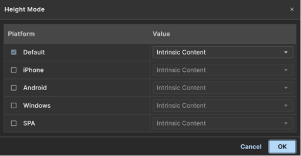 To provide a platform-specific or default value, click the Ellipsis button (...) to open the Height Mode dialog box, and then select a value.
