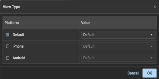 The selected view type becomes the default for all the platforms. To provide a platform-specific value or a different default value, click the Ellipsis button (...) to open the View Type dialog box, and then select a value.