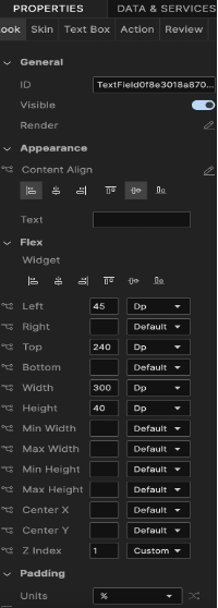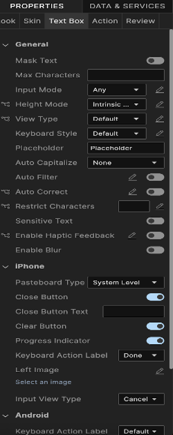 TextBox properties specify properties that are available on any platform supported by Volt MX Iris, and assign platform-specific properties.