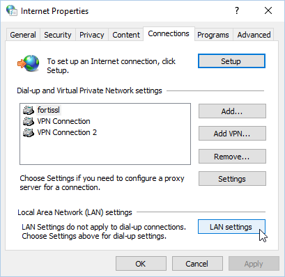 - Under Proxy server, check the check box for using a proxy server for your LAN.