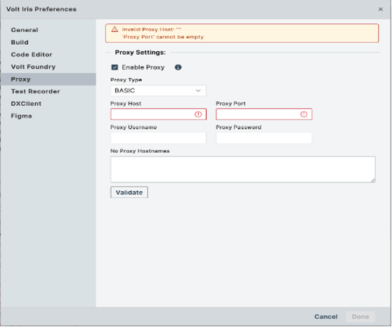 If you have not configured the Proxy Server during the Installation process, you can enable Proxy configuration and edit the Proxy Settings through the Preferences section in Volt MX Iris.