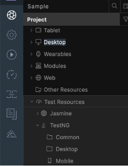 The Test Resources folder contains TestNG and Jasmine folders by default. The folders further contain default channel folders.