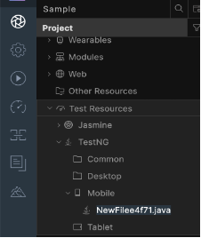 You can create a new test script specific to the channel by placing a test script within the channel's sub folder. If the file is created under the TestNG or Jasmine sub directory, the new file contains an empty shell with the basic TestNG or Jasmine test script. When you make edits to a script, it is saved when the project is saved.