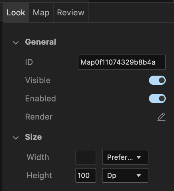 On the Look tab, you define properties and behaviors related to a Map widget's appearance and position. The following sections describe each of the properties.