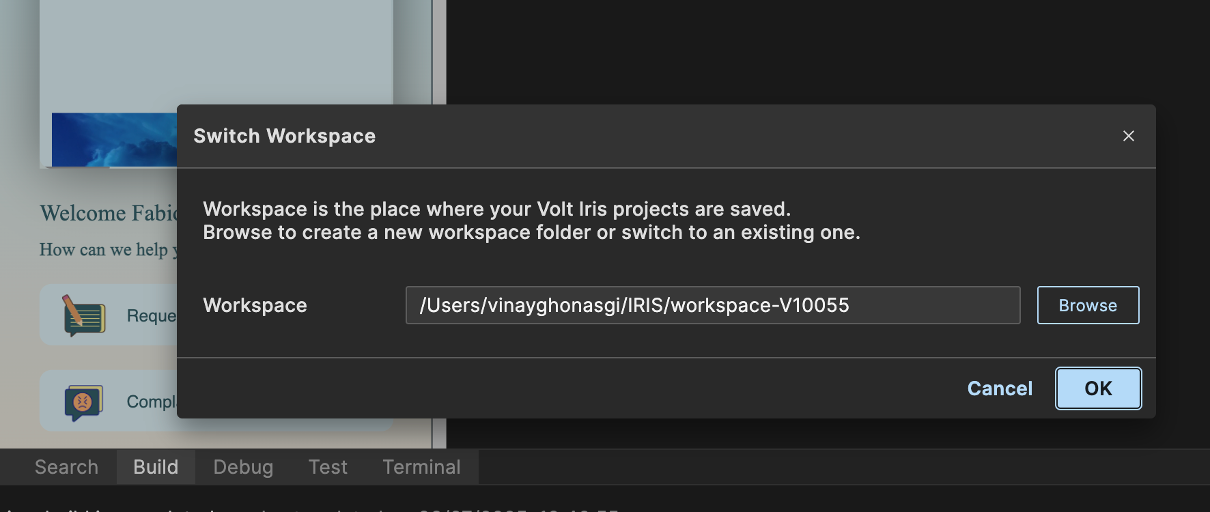 You can switch your workspace either during the VoltMX Iris startup process or from within Volt MX Iris. This feature helps you to switch the workspace when the default workspace has an issue or is not valid. Furthermore, you can switch the workspace if you want to access projects that are located in another workspace.