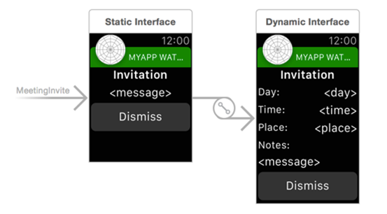 Dynamic notification forms enable you to customize the way your watch app displays a notification's content. The following illustration shows the difference between a static and a dynamic notification form.