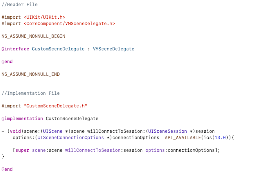 Ensure your custom class is a subclass of VMSceneDelegate and that you have selected Objective-C as the programming language. When Xcode creates your custom class, it generates a header file (.h) and an implementation file (.m), then adds them to your project.