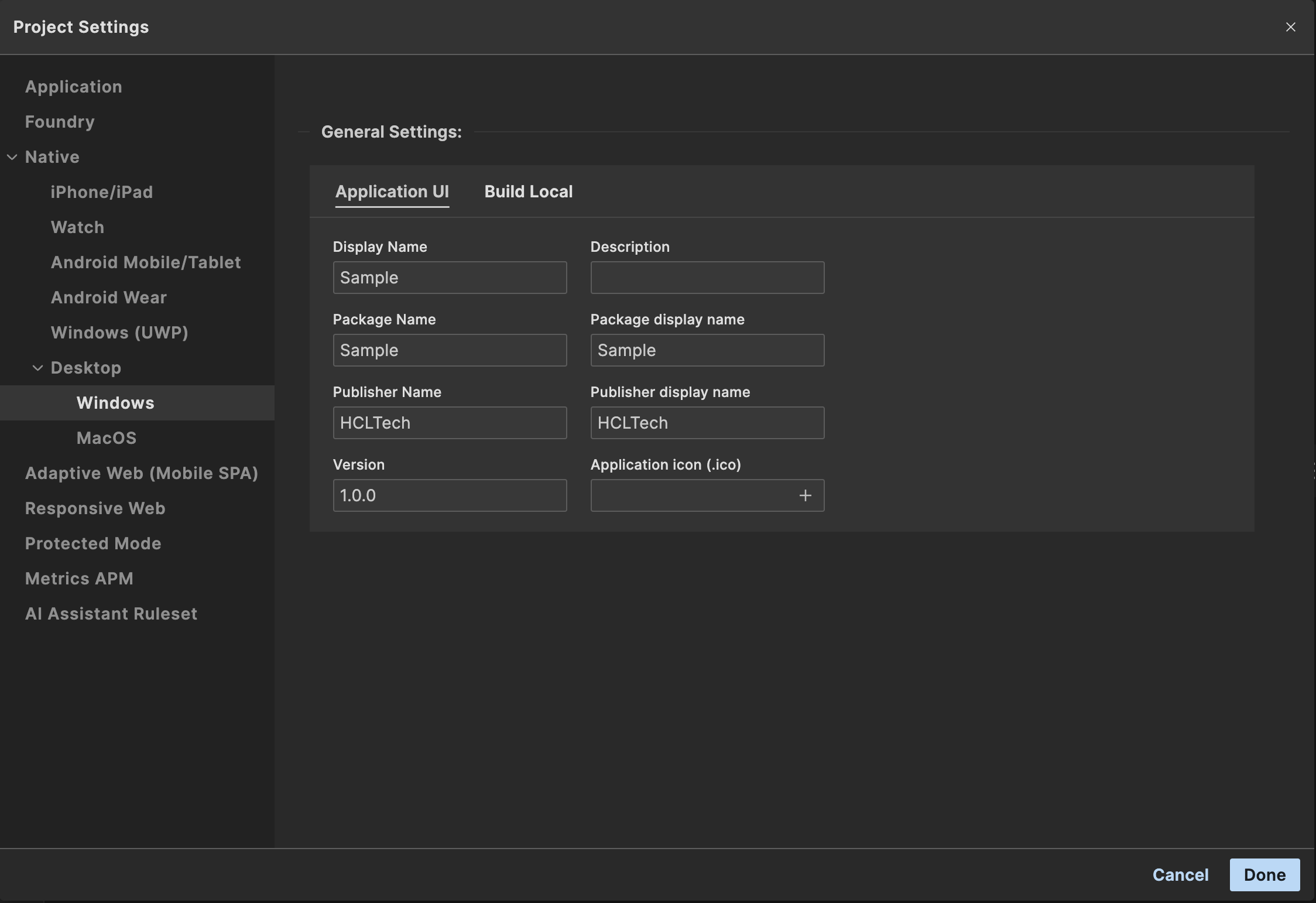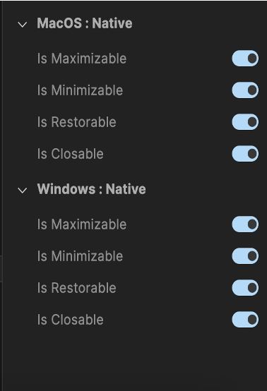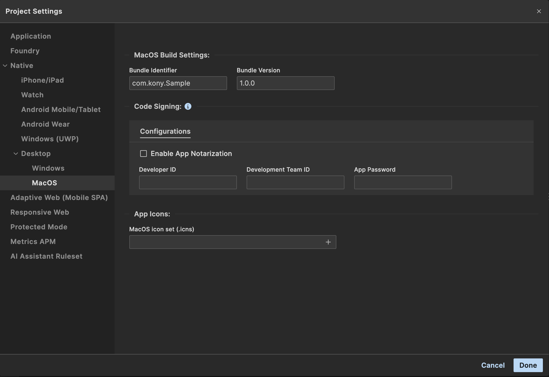 There are some platform specific project settings for the macOS and Windows native platforms. To view or update these settings, go to Project Settings -> Native -> Desktop and choose either macOS or Windows.