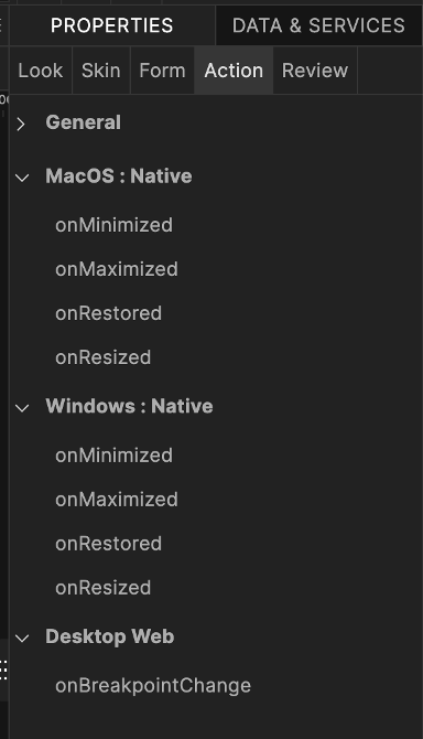 In addition to properties, there are a set of actions your application can take when window events are triggered. These are accessible in the Action tab. In addition to general actions, there are a set specific to the desktop window state.