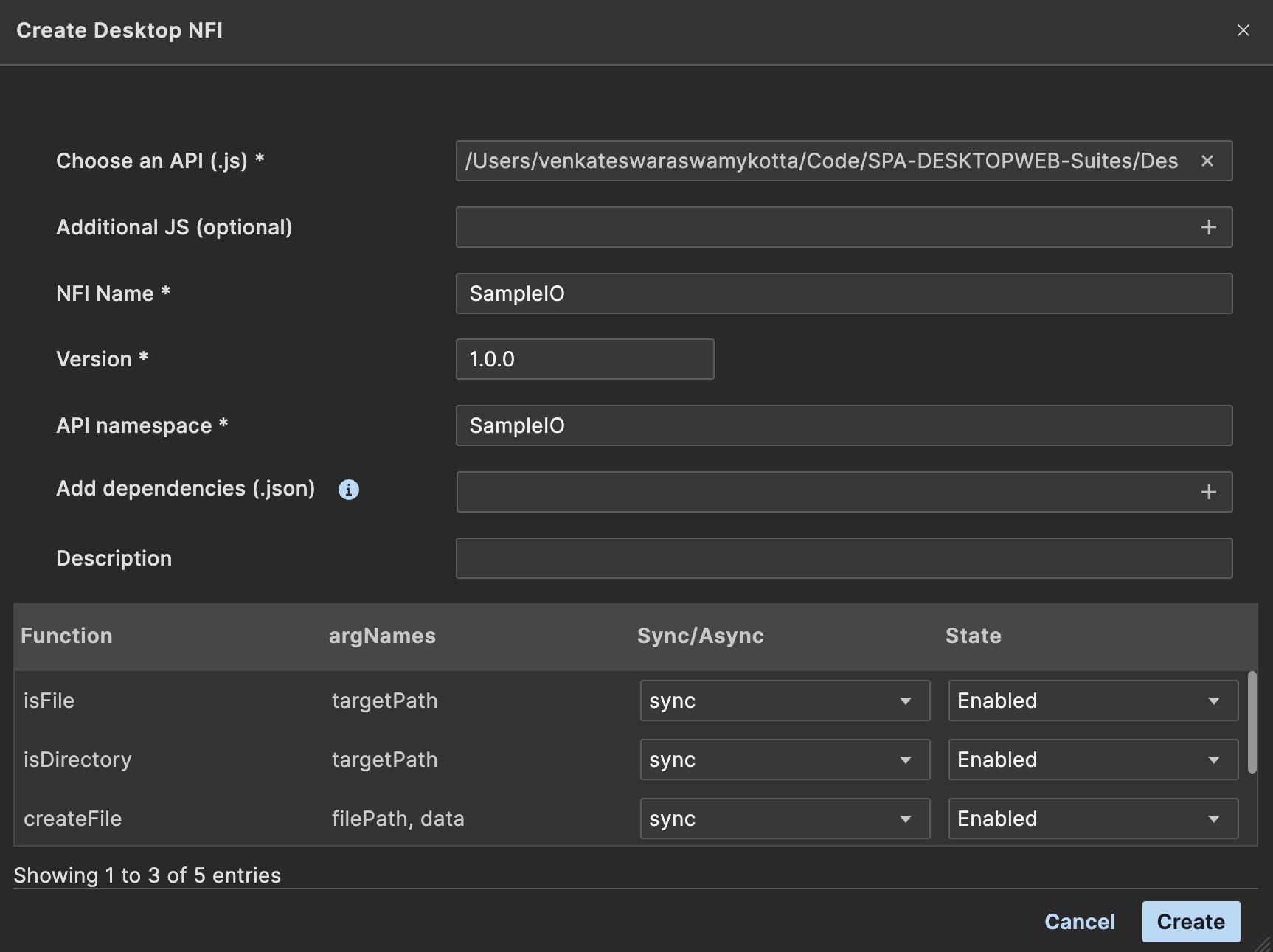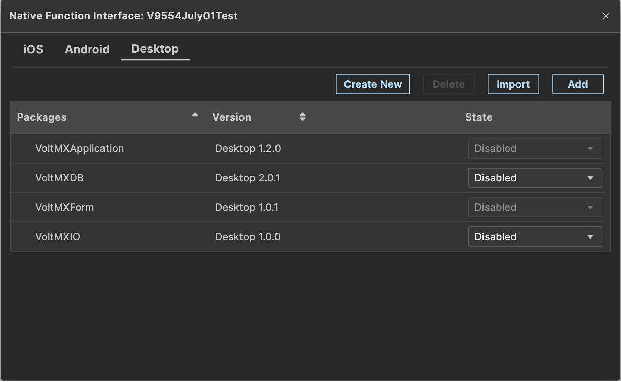 To add NFIs to your desktop native application, from the menu select Edit -> Manage Native Function Apis. Select the Desktop tab. From this popup you can import an NFI, create a new NFI, or delete an existing NFI from your application.