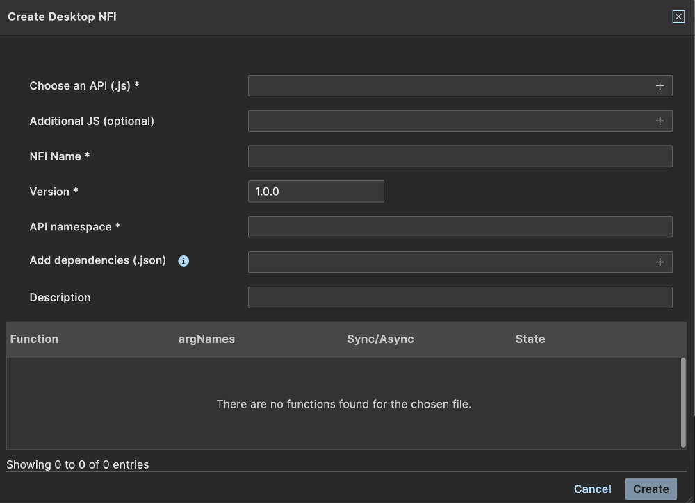 If your NFI requires Node.js modules or native binaries, upload a .json file using the Add Dependencies (.json) field.