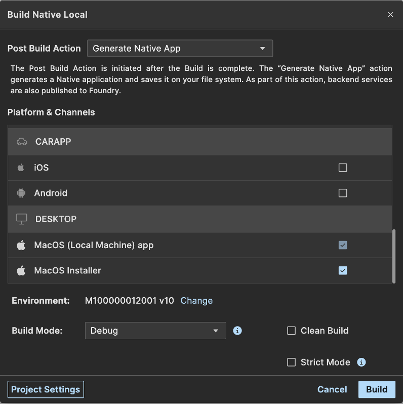 Choose Generate Native App from the Post Build Action dropdown and in the Platform and Channels table, under the DESKTOP channel choose the option for the (Local Machine) app or Installer you’d like to build. The app and Installer are listed for the platform on which your Volt MX is running. Due to platform module dependencies, you can only build the app for the same OS on which Volt MX is running. Note: The app will be generated to run across architectures for the same OS.