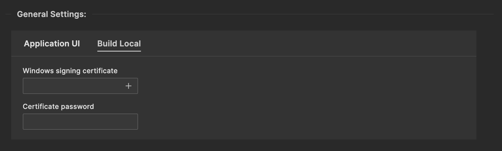 Windows signing certificate – A valid signing certificate for your Windows application. This file is chosen using a file picker. The certificate file is copied into your project when the settings are saved.