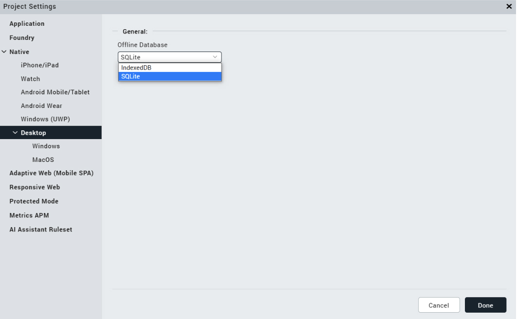 Desktop Native platforms support two databases, namely IndexedDB and SQLite.