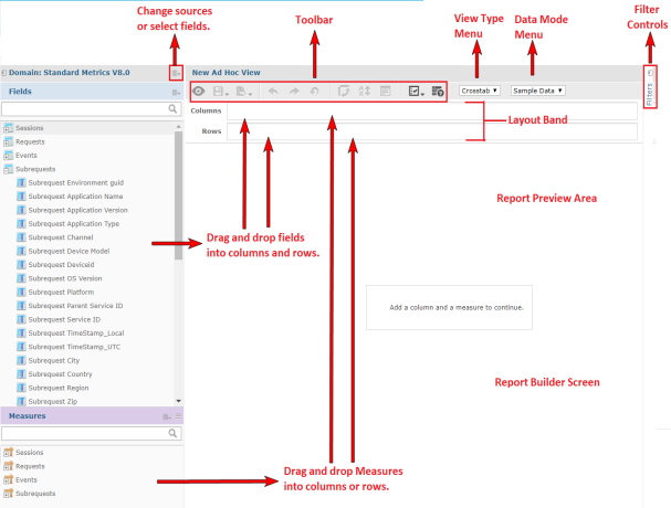 Note: The default data view type is Crosstab. You can change it to either Table, Chart or Crosstab after the report builder user interface gets loaded.