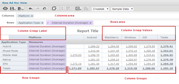 The following picture illustrates a Crosstab Report in the Ad Hoc editor.
