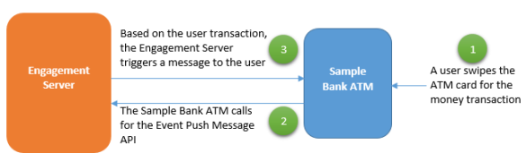 To understand events, let us assume that a bank wants to inform about the ATM transaction done by users. When a user swipes the ATM card for money, the ATM contacts the Engagement server through the Event Push Message API. Based on the generated event ID the Bank (the Event Push Message API is called) triggers the event push notification to the user about the ATM transaction.