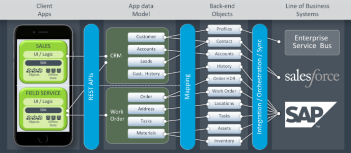 In a field services app, the client app contains front-end and custom logic that executes the assigned tasks. The field service app interacts with the App Data Model (an Object Model) that contains work order with data in terms of the order, address, tasks, and materials. These are the objects with which the client app will interact. On the other hand, there is a back-end with its own object structure. You can map these objects by using either one-to-one or one-to-many or many-to-many relationships. You can set filters as to what data to send with the help of an object model. Now, the back-end objects can interact with the Source of Truth such as Salesforce, SAP, and Legacy Data through either built-in adapters or through Integration or Orchestration services.