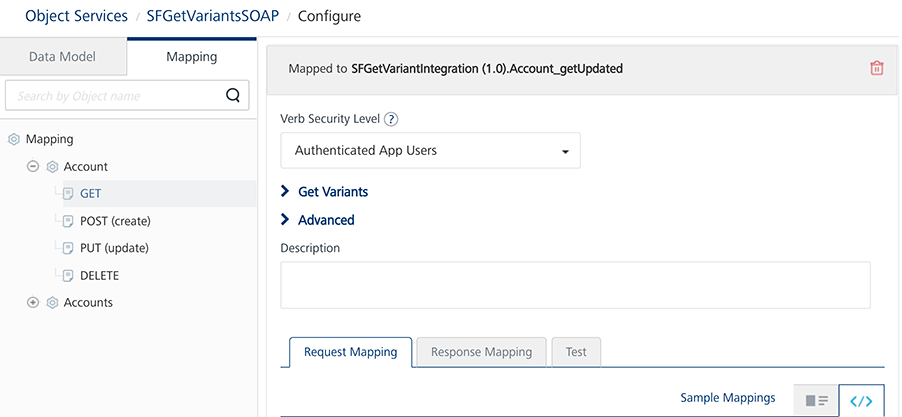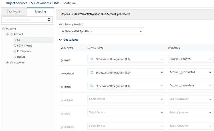 Note: In Object Service Mapping, getVerbMapping can be mapped to the getupdated verb. If the same service can download all the records for a default value of timestamp, this service can also be mapped to the GET verb.