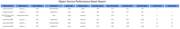 Object Service Performance Detail displays the performance parameters such as the time taken to upload or download service in terms of average time and maximum time, data transferred in KB, and the number of records transferred.
