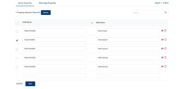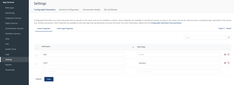 From the left pane, click Settings > Configurable Parameters tab. Here you can define the key value pairs for Server Properties and Client App Properties. By default, the Server Properties tab is selected.